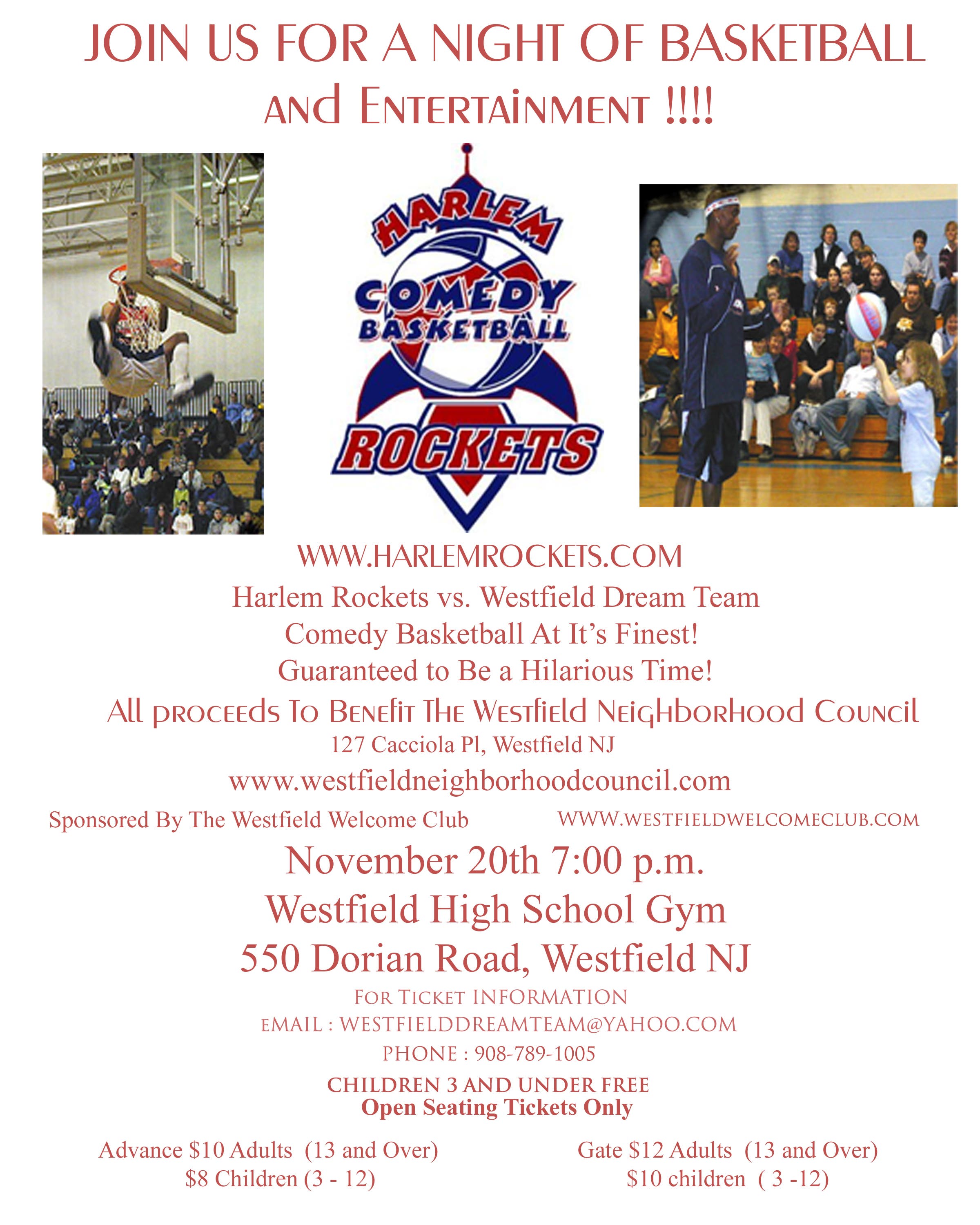 The Harlem Rockets have been thrilling fans with their combination of basketball skills, zany comedy and audience participation for years. The Harlem Rockets' opponents come from the local community and will be playing against the teachers, EMTs, fire fighters and more of Westfield. For more information, please visit www.harlemrockets.com