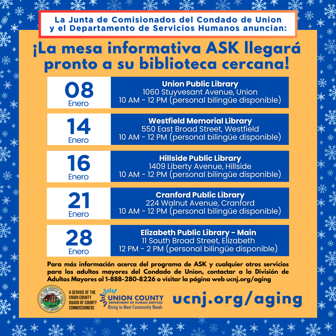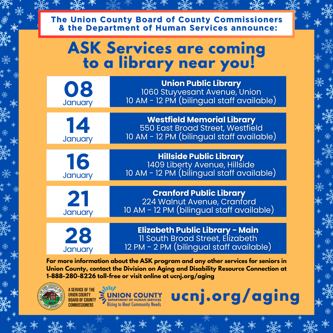 For more information about the ASK events and any other services for seniors in Union County, contact the Division on Aging and Disability Resource Connection at 1-888-280-8226 toll-free or visit online at ucnj.org/dhs/aging.