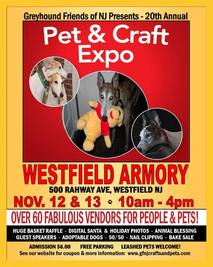 Westfield, NJ - Greyhound Friends of New Jersey’s (GFNJ) 20th Annual Pet & Craft Expo will return to the Westfield Armory, 500 Rahway Ave. in Westfield on Nov. 12 and 13. Hours are Saturday and Sunday from 10 am-4 pm. Admission is $6, a $1.00 discount coupon is available on-line, children 12 and under are free. Visit gfnjcraftsandpets.com to print your coupon.