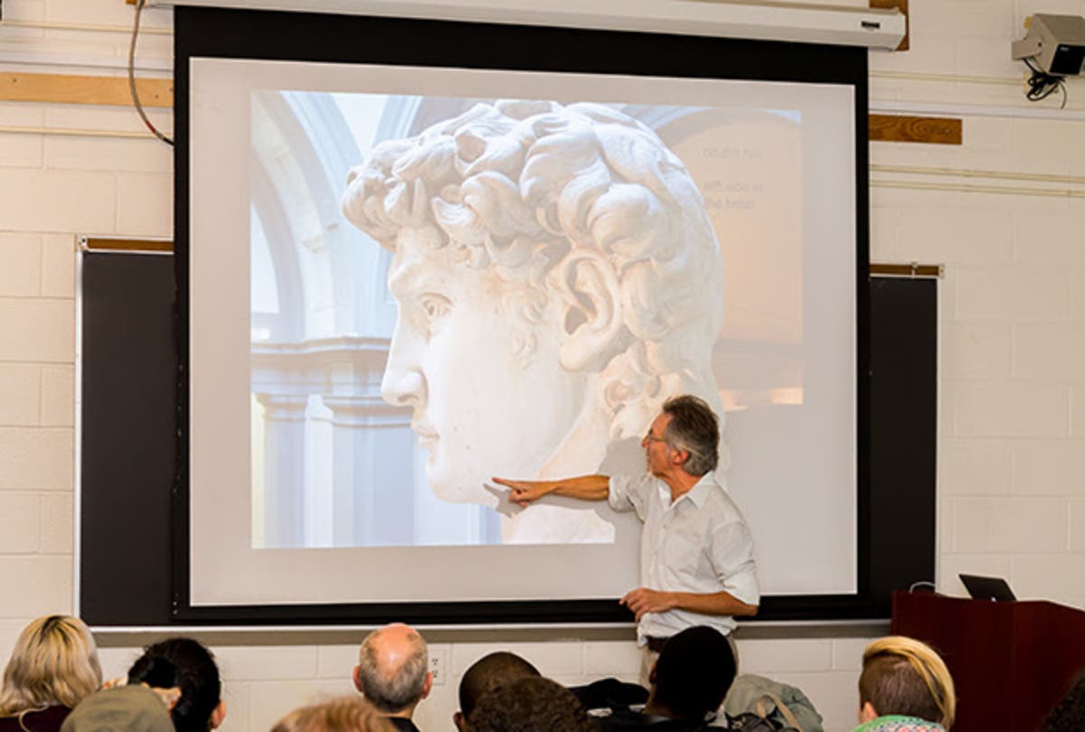 From Kean University: Professor and researcher in geological studies at the University of Siena in Italy Marco Giamello shared insights on the science of art with Kean University’s Fine Arts Conservatory students. In a guest lecture, he presented observations from his studies of the masterpieces of Tuscan sculptors, including Michelangelo’s David and Tino di Camaino’s Triptych.