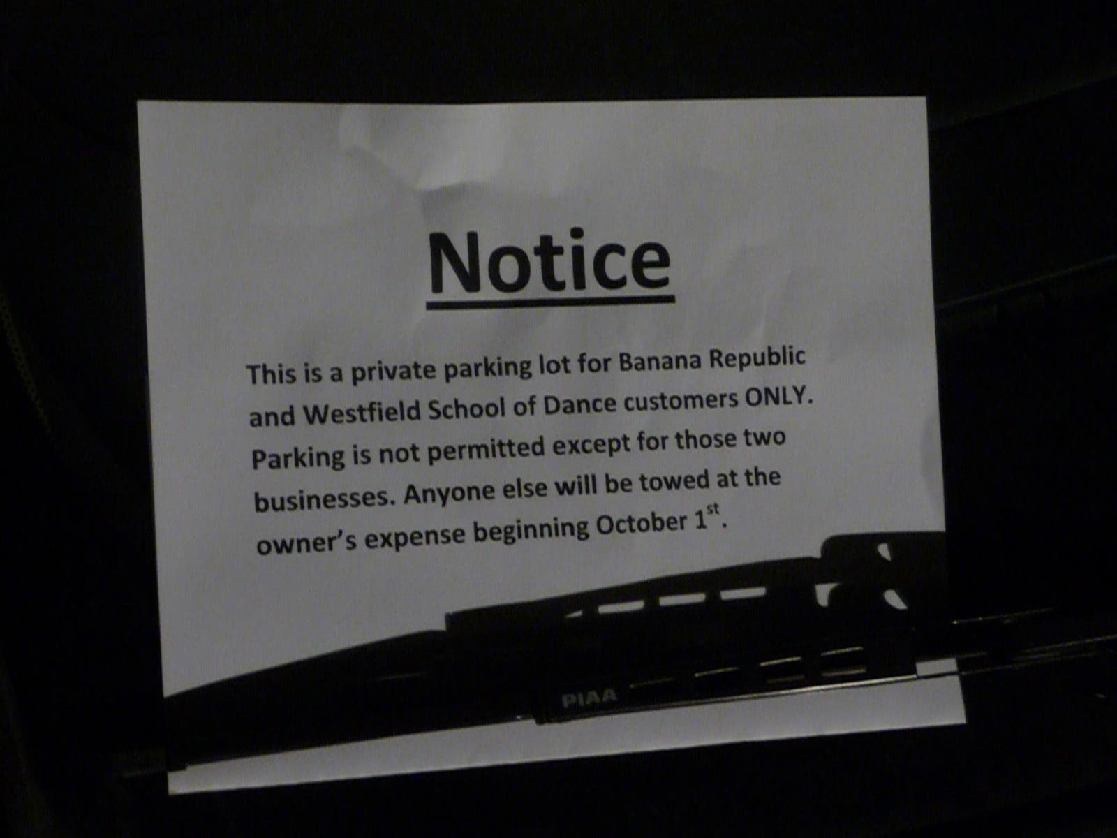 The notice, which is signed by "management," was placed on cars in the lot during the early evening hours. Several cars parked in the lot were observed to have the papers on them. It is not known if the signs were distributed by Banana Republic, the dancing school or an outside landlord.