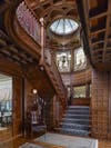 The rooms off the foyer can be closed off by closing a series of pocket doors. The impressive library originally used as an after-dinner “smoking room” provides excellent examples of the Arts and Crafts movement that, when the mansion was new, was just beginning to gain favor among the Victorians.