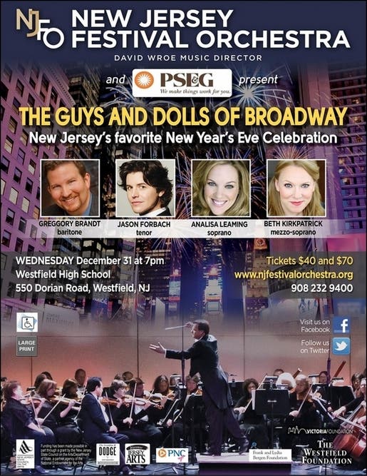 On Wednesday, December 31st, at 7pm, the NJ Festival Orchestra again presents one of New Jersey’s most popular New Year’s Eve musical celebrations. This year’s performance, The Guys and Dolls of Broadway, promises a superb revue of American musical theater favorites presented in glorious symphonic splendor and will be appreciated by young and not-so-young alike