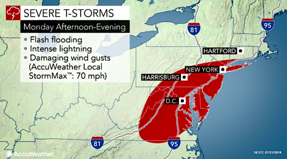 The National Weather Service has issued a hazardous weather outlook and a flash flood watch for all of New Jersey, saying thunderstorms on Monday afternoon and evening could produce severe weather. Damaging winds as strong as 70-mph are the biggest threat, the NWS says.
