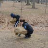Student volunteers spend a chilly weekend morning preparing the cold ground for a new bed of native wildflowers and grasses.