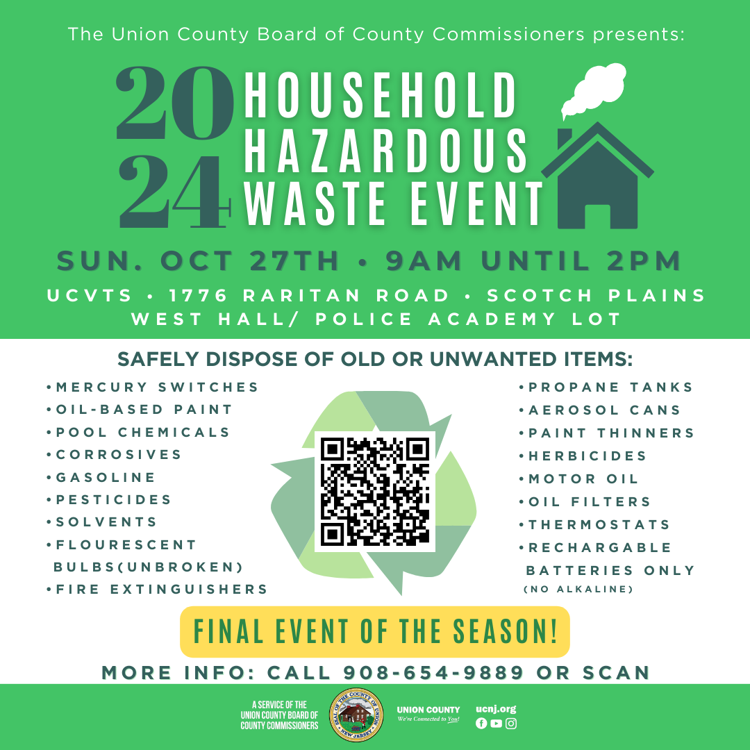 SCOTCH PLAINS, NJ — The Union County Board of County Commissioners invites all Union County residents to participate in the final Household Hazardous Waste event of the 2024 season.