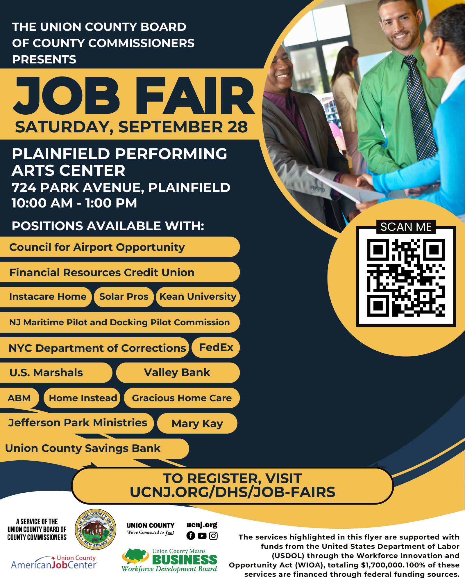 UNION COUNTY, NJ — The Union County Board of County Commissioners, in collaboration with the American Job Center, announces that a Job Fair will be held on Saturday, Sept. 28, at the Plainfield Performing Arts Center, at 724 Park Avenue in Plainfield.