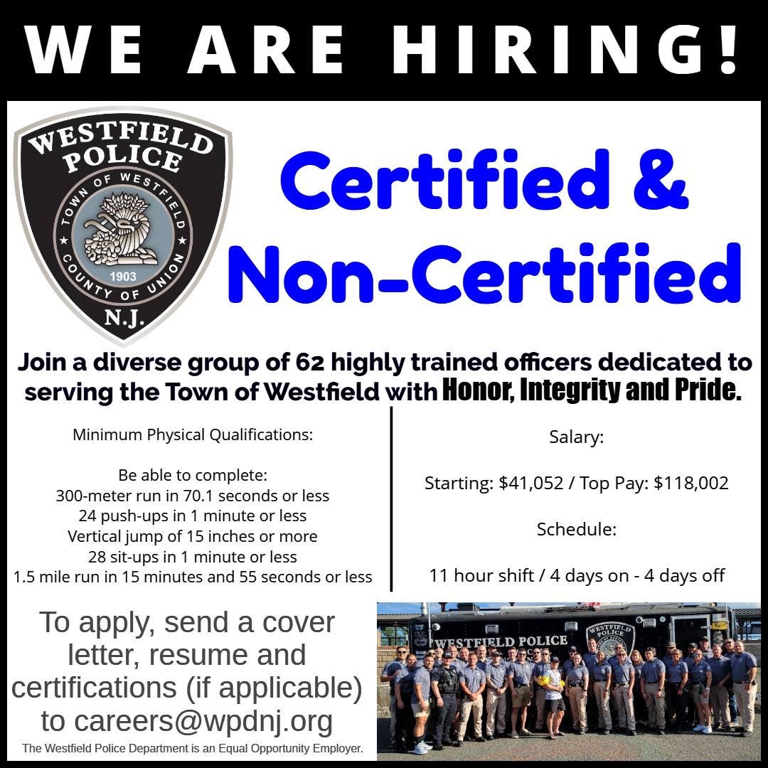 WESTFIELD, NJ — The Westfield Police Department is hiring.