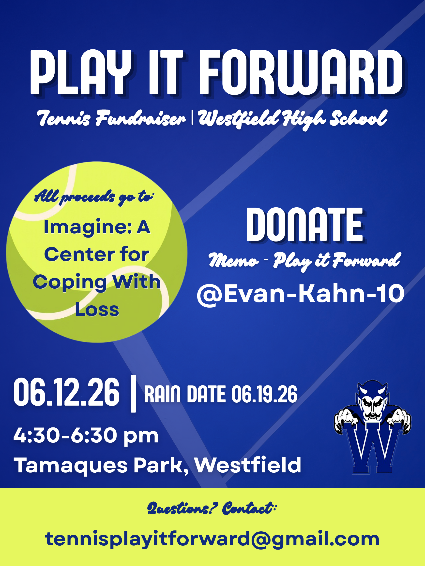 WESTFIELD, NJ — Westfield High School's boys and girls varsity tennis teams are set to host the fifth annual Play It Forward doubles tournament on June 12 at Tamaques Park.