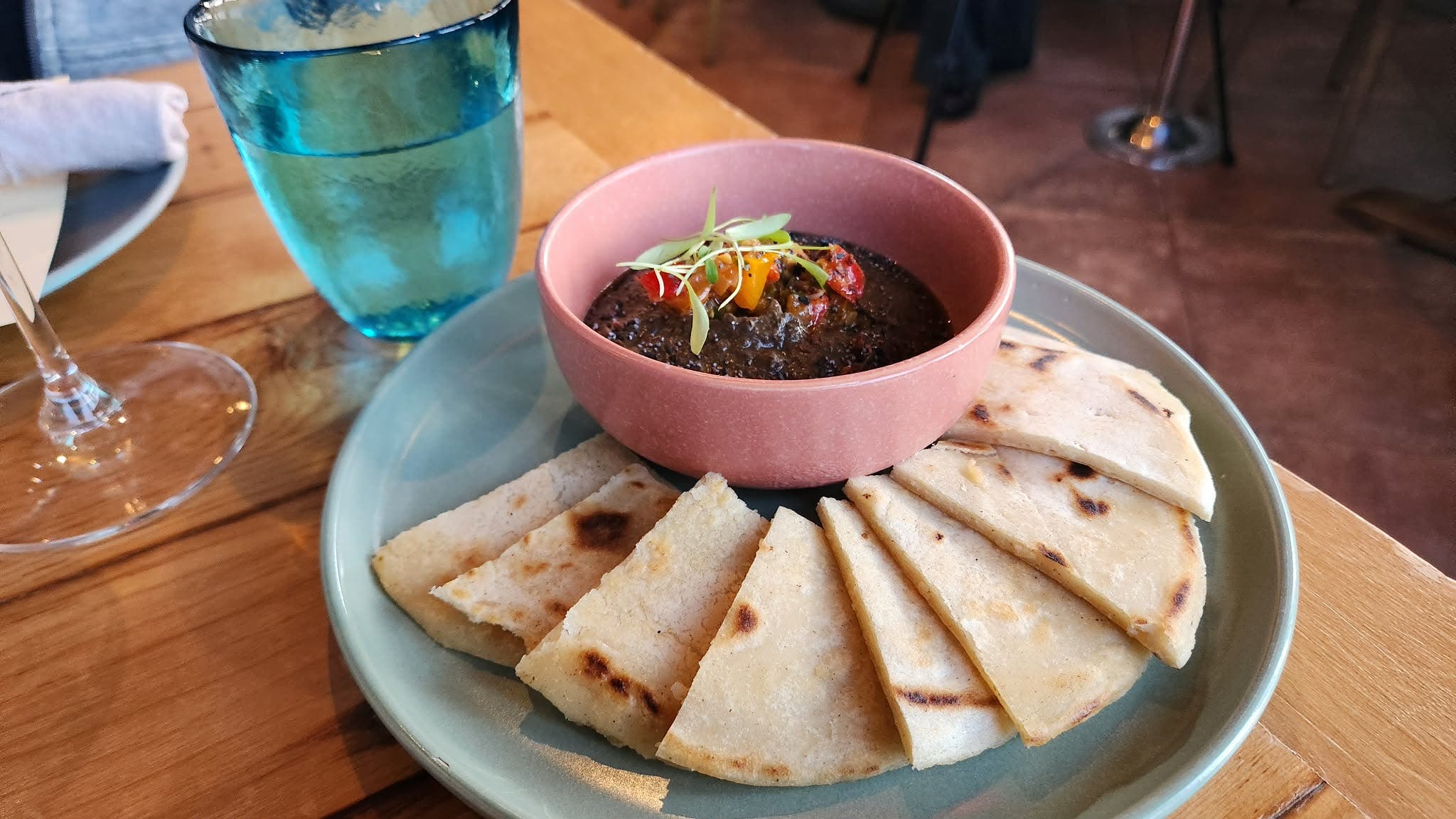 Henneberry showcased a delicious new starter called the Pasilla Oaxaca Black Bean Puree with charred jalapeno sofrito, black garlic, black sesame, and warm corn gordita.