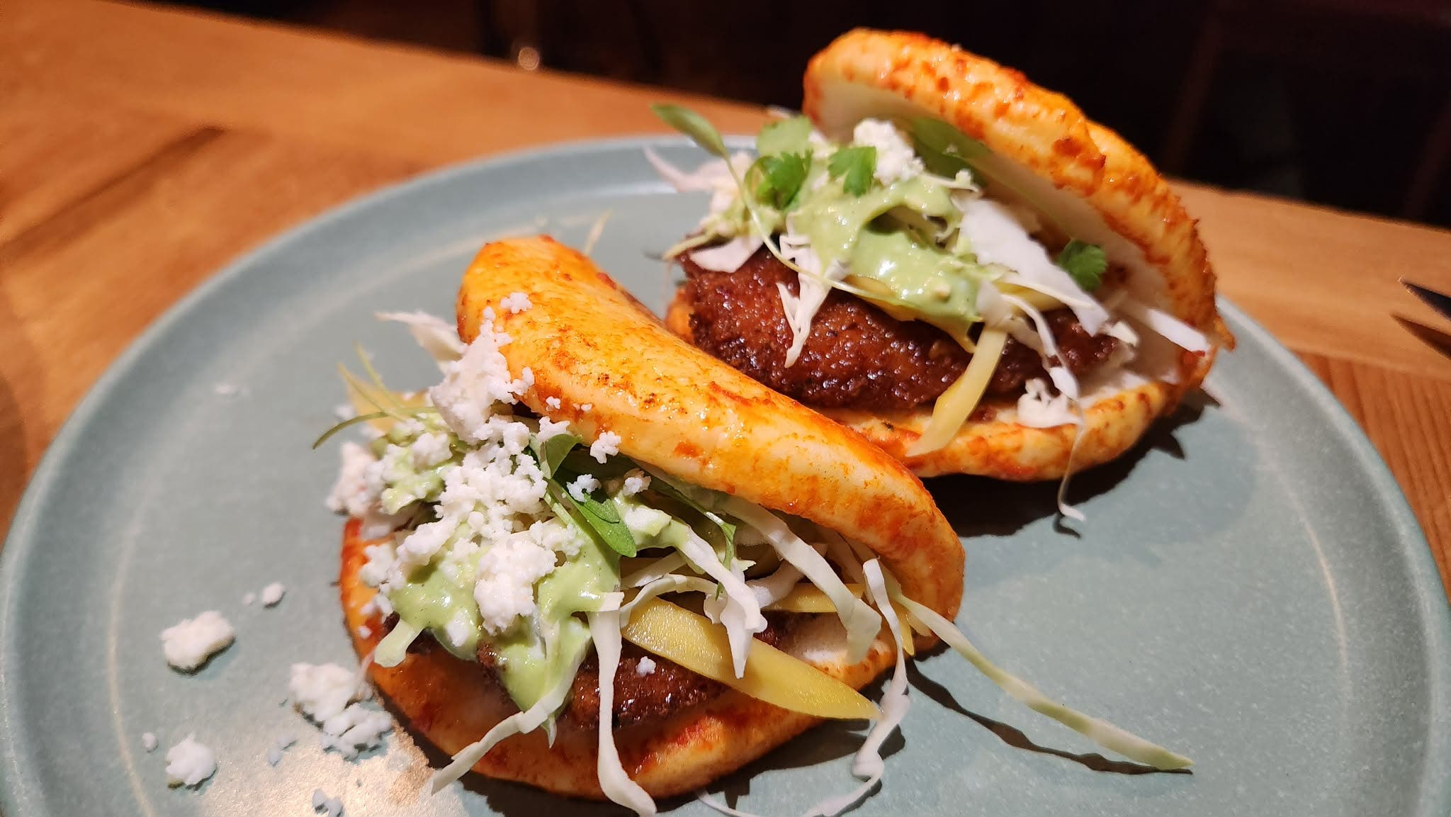 The bun is dipped in a chili sauce and then pan-fried and topped with hot honey crispy chicken, pickled mango, cabbage aji verde, and queso fresco.