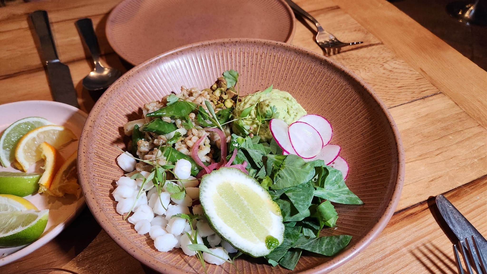 The Tamarind Chipotle Duck features lime-scented farro, snap pea, jicama, scallion, serrano, spiced pistachio, basil oil, and avocado foam.