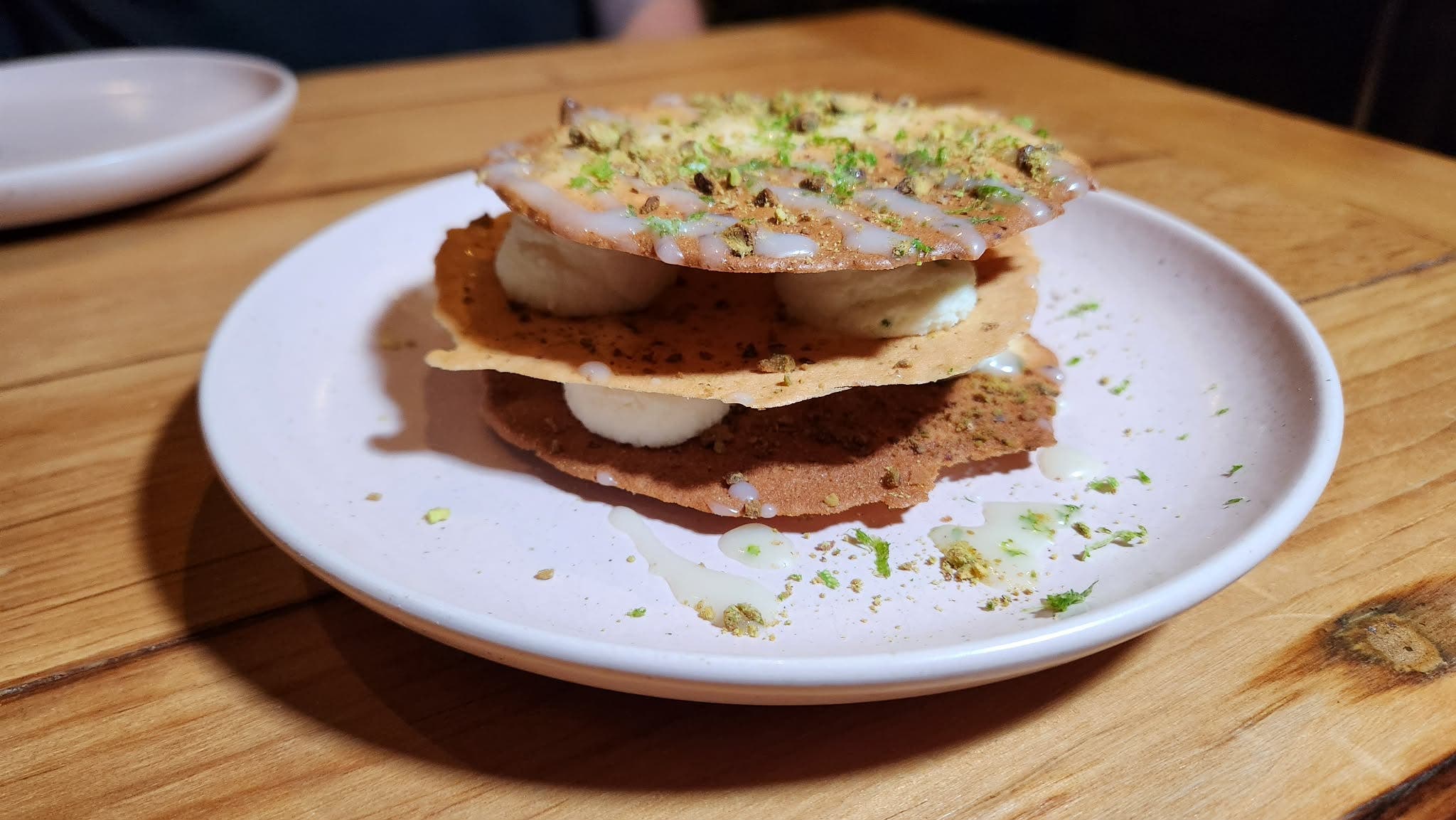 To end things on a sweet note, Maize is serving Caralota de Limon Tostada featuring coconut-lime mascarpone, crisp shell, white chocolate, and salted pistachio.