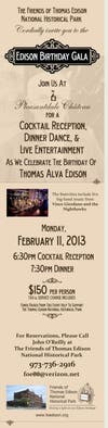 On Monday, February 11, 2013, Pleasantdale Château in West Orange, NJ will host an “Edison Birthday Gala.” The event, organized by the Friends of Thomas Edison National Historical Park, will include a cocktail reception, dinner dance, and live big-band music from Vince Giordano and the Nighthawks. Proceeds generated from ticket purchases will help to support the Thomas Edison National Historical Park.