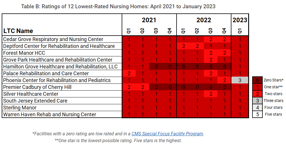 Together, the 12 nursing homes cited in this year’s report receive more than $100 million every year in New Jersey Medicaid funds, even though several of them have “provided poor care” to residents for almost a decade, the comptroller’s office charged. All 12 of the nursing homes have consistently received one of five stars, the lowest possible rating from the U.S. Centers for Medicare and Medicaid Services (CMS).