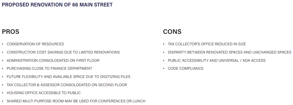 According to the firm, the town is currently using two properties to house their municipal departments: 66 Main Street and 25 Lakeside Avenue.