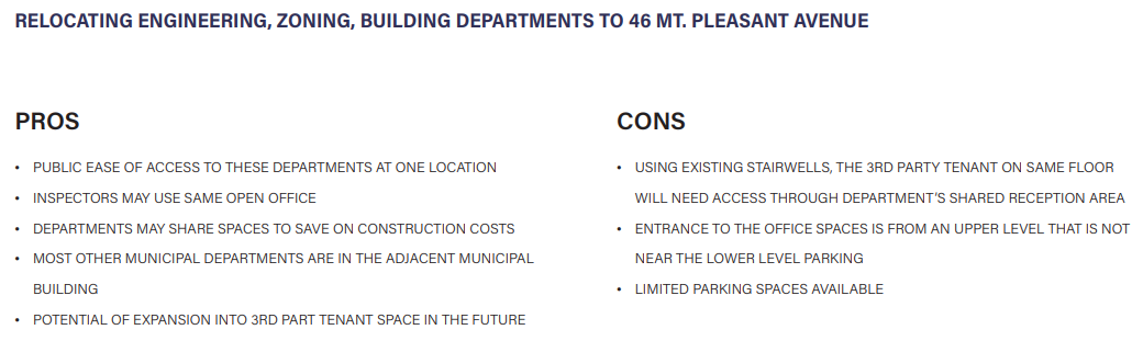 - “The property at 46 Mt. Pleasant Avenue is adjacent to the Town Hall. Moving some of the municipal department to this facility will allow the visitors to maintain access to the Town Hall while visiting this location.”