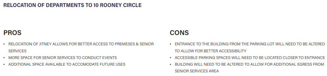 - “The property at 10 Rooney Circle is not a walking distance from the Town Hall or the senior living center adjacent to the Town Hall. It will require a vehicle to transport people approximately 10 minutes away from the Town Hall area.”