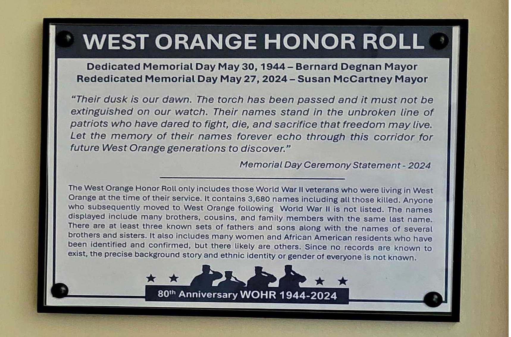 The West Orange Honor Roll was originally dedicated at Town Hall on Memorial Day in 1944 with 3,000 people in attendance.