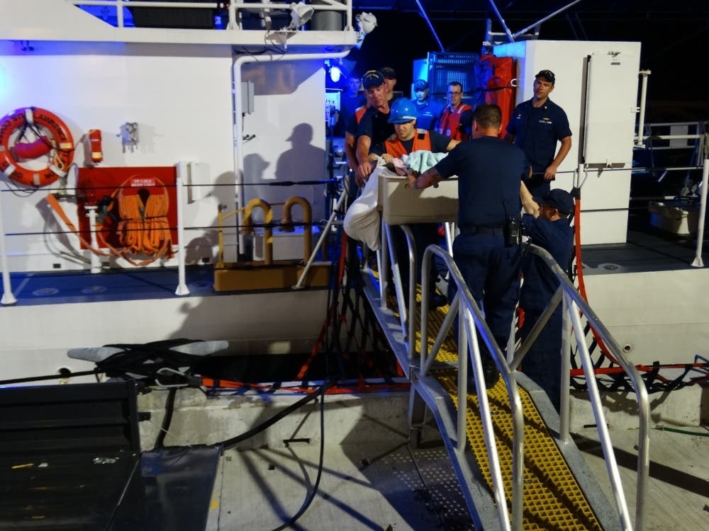 After the rescuers safely secured the turtle, crew members brought it around to the rear of the Lawrence Lawson to an area called a stern notch, which is used to deploy the cutter’s small boat. The turtle was lifted into the stern notch, where scientists from MERR and Sea Turtle Recovery provided it aid, care and assessed its condition.