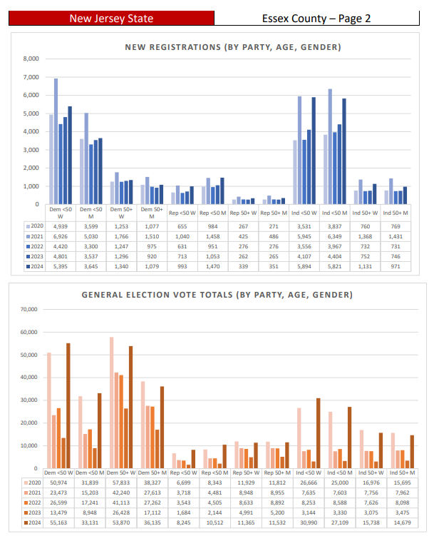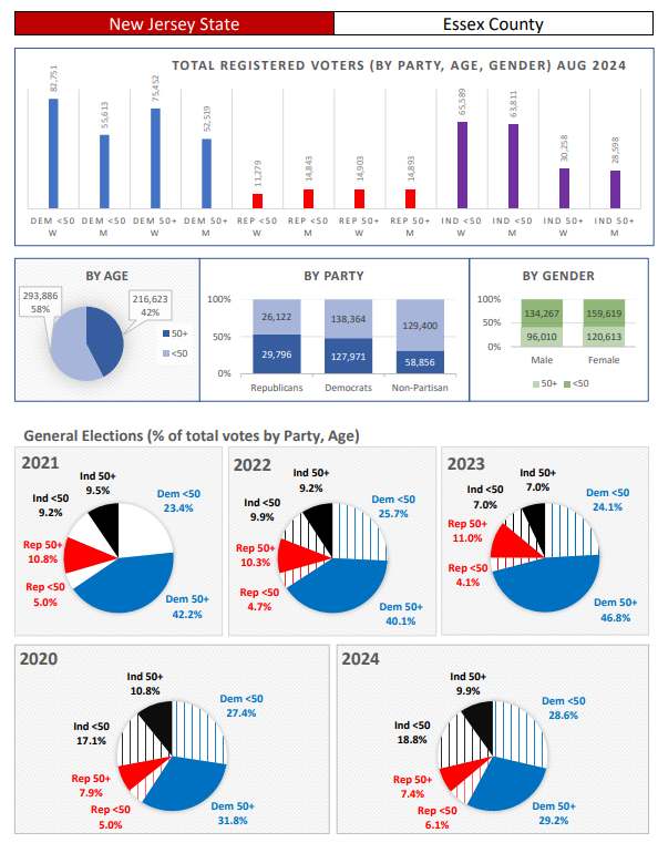 “In presidential elections, voter turnout in the Garden State is widespread across all age groups. However, in non-presidential years, voters aged 50 and over – both Democrats and Republicans – dominate the electorate, often by a substantial margin. The report reveals that in every county reviewed, voters aged 50 and over represent the majority of turnout, with some counties, such as Hunterdon and Morris, seeing turnout rates exceeding 70% in off-year elections. This demographic's strong presence underscores their outsized influence, particularly in local and state elections.”