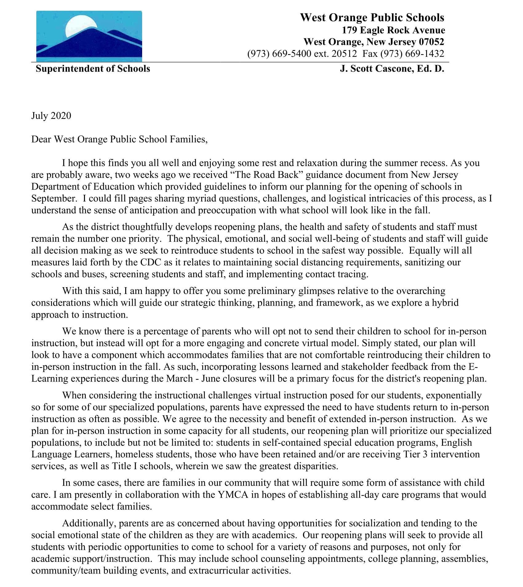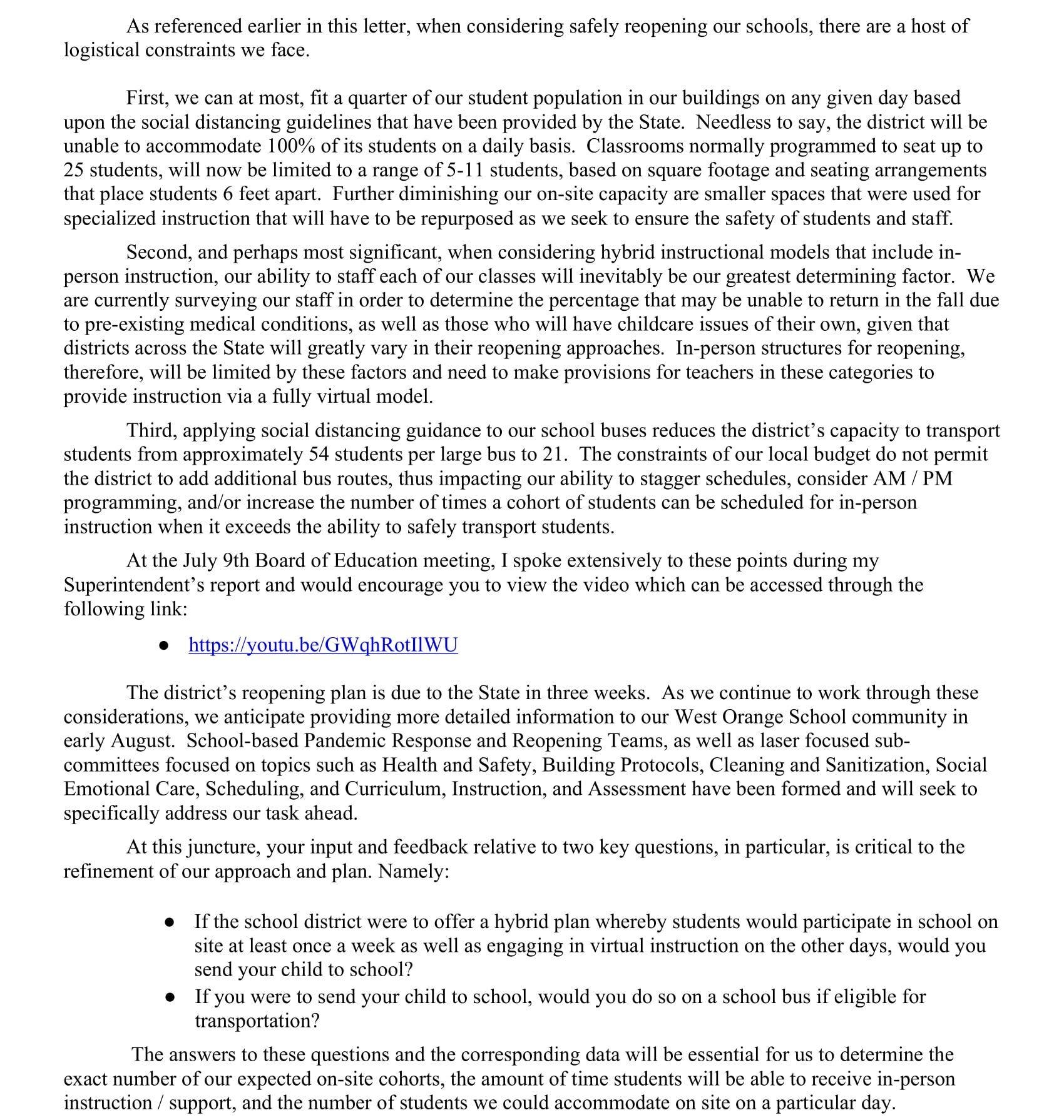West Orange school officials are asking for the public’s feedback on reopening via an online survey, which can be seen here. The survey will remain open until July 20.