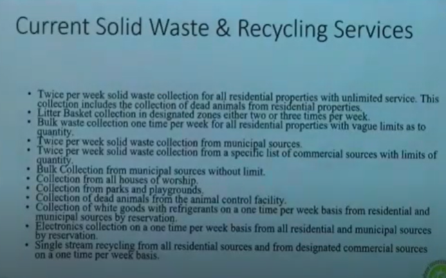 He presented a slide that lists the current solid waste and recycling services in the township, which can be seen below.