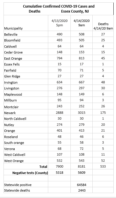 On Tuesday morning, Essex County officials released the latest COVID-19 counts for West Orange. There have been 543 confirmed cases, with 52 deaths linked to the disease.