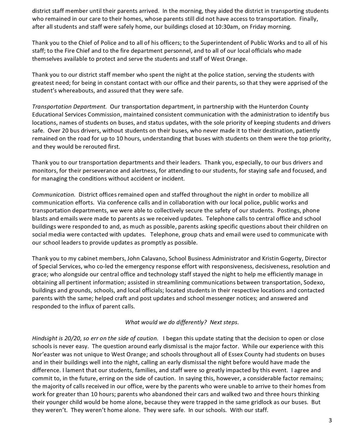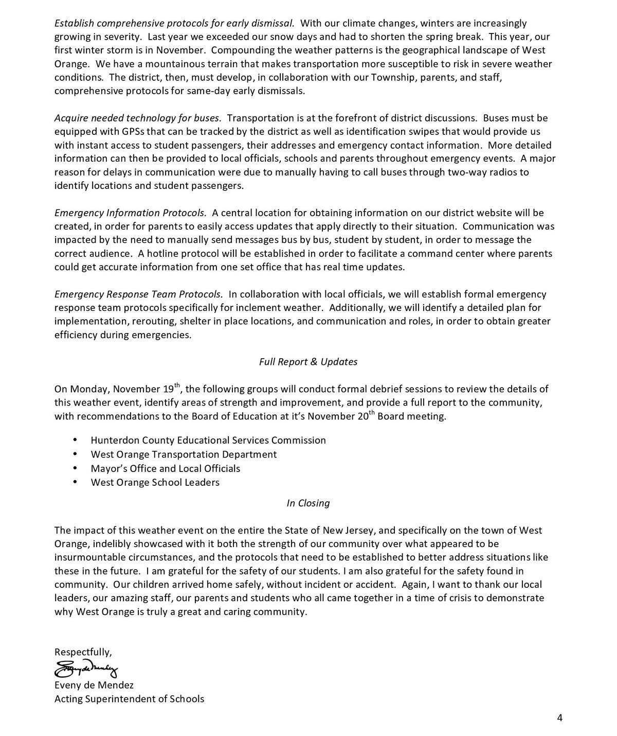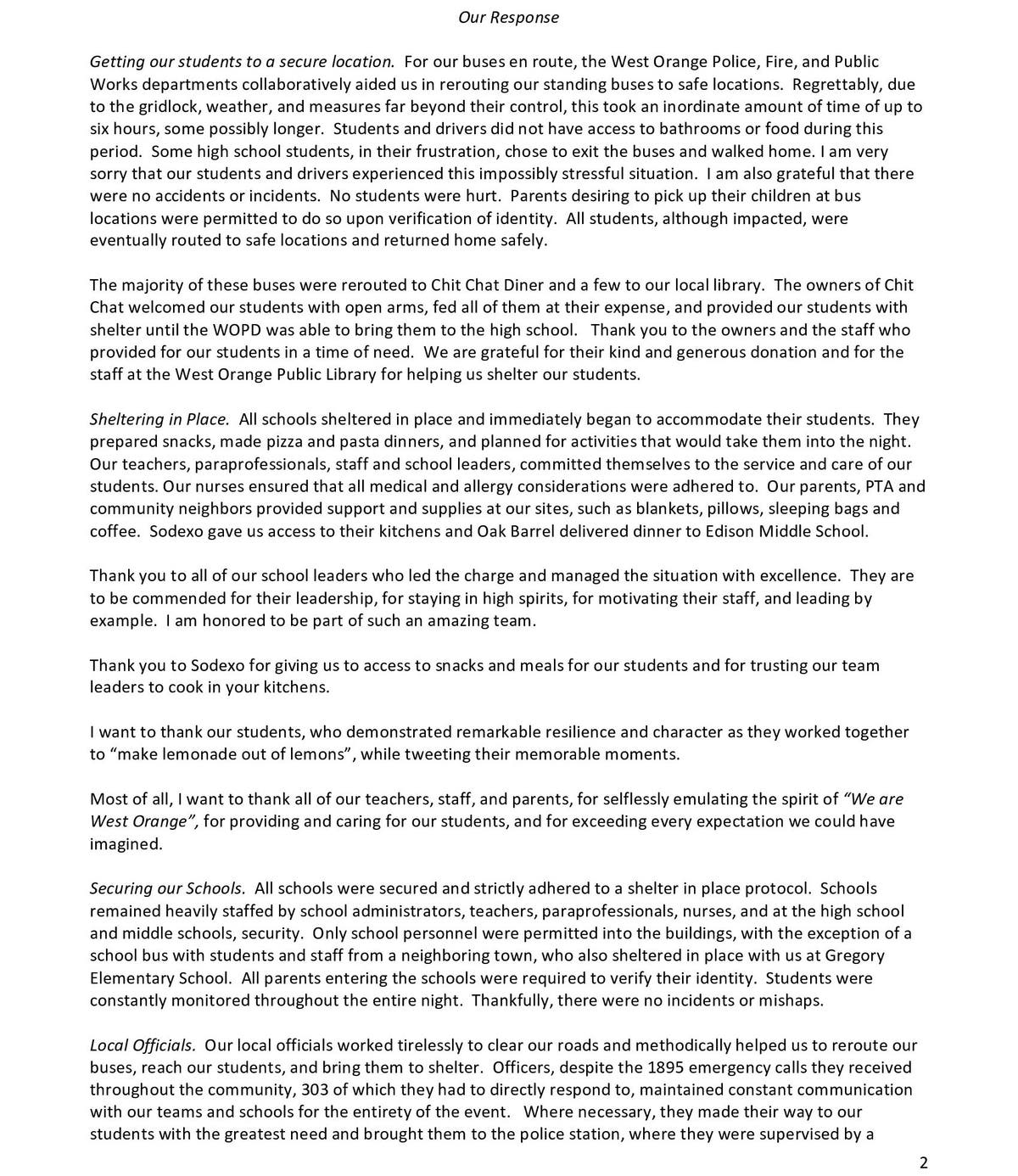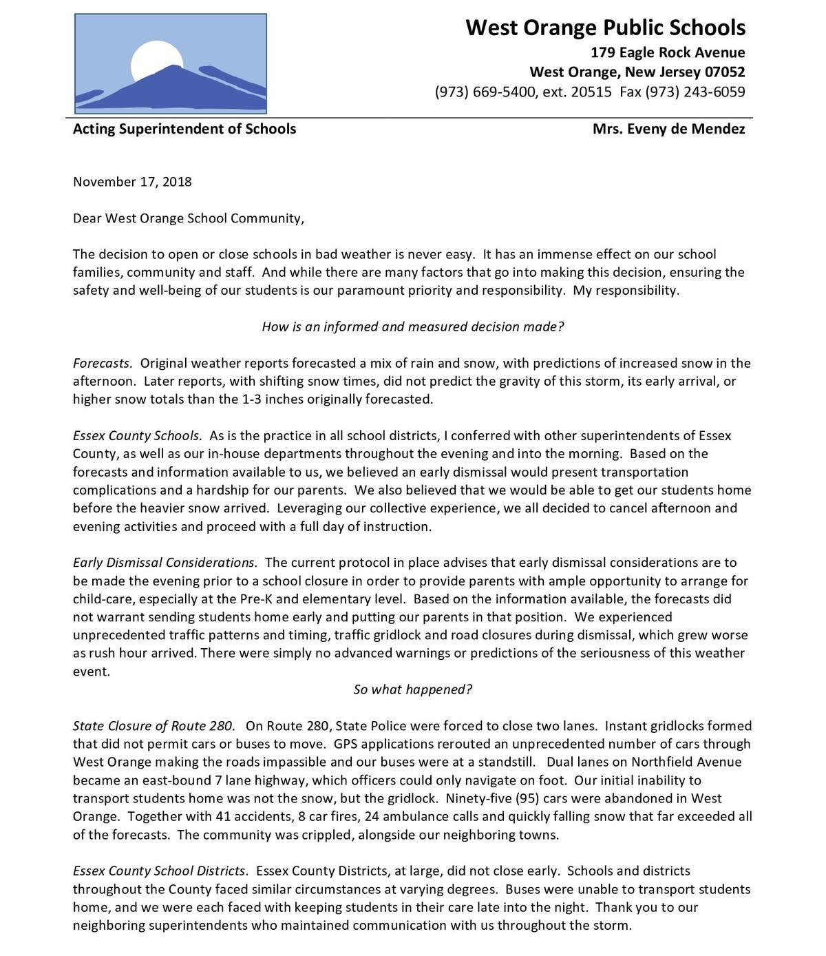 On Saturday, West Orange Acting Superintendent Eveny de Mendez wrote school community members a detailed letter about the district’s response to the snowstorm, as well as the decision-making process that led to the choice to hold what may be the largest slumber party in the township’s history.