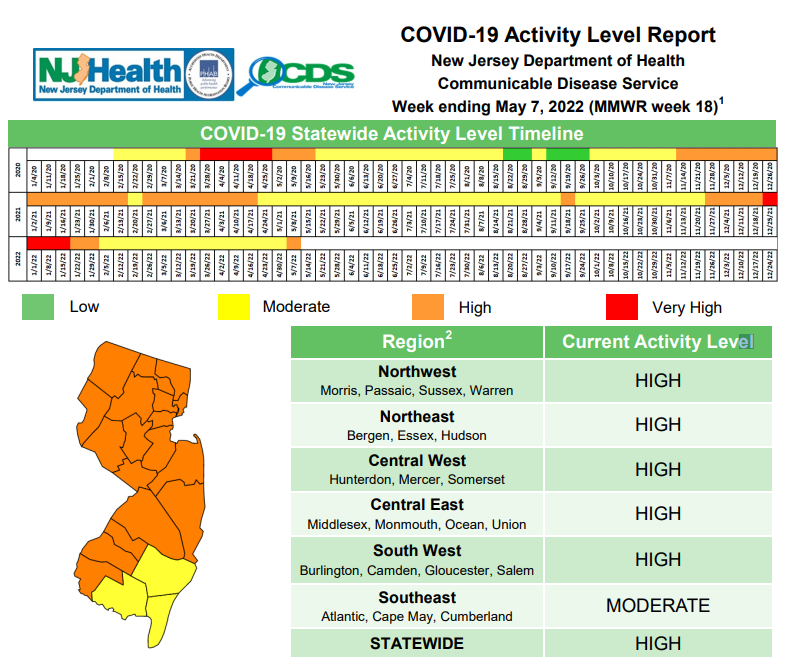 As of the week ending May 7, the Northeast area of the state – Bergen, Essex and Hudson counties – was at a “high” activity level, as were all but one other region (see chart below).