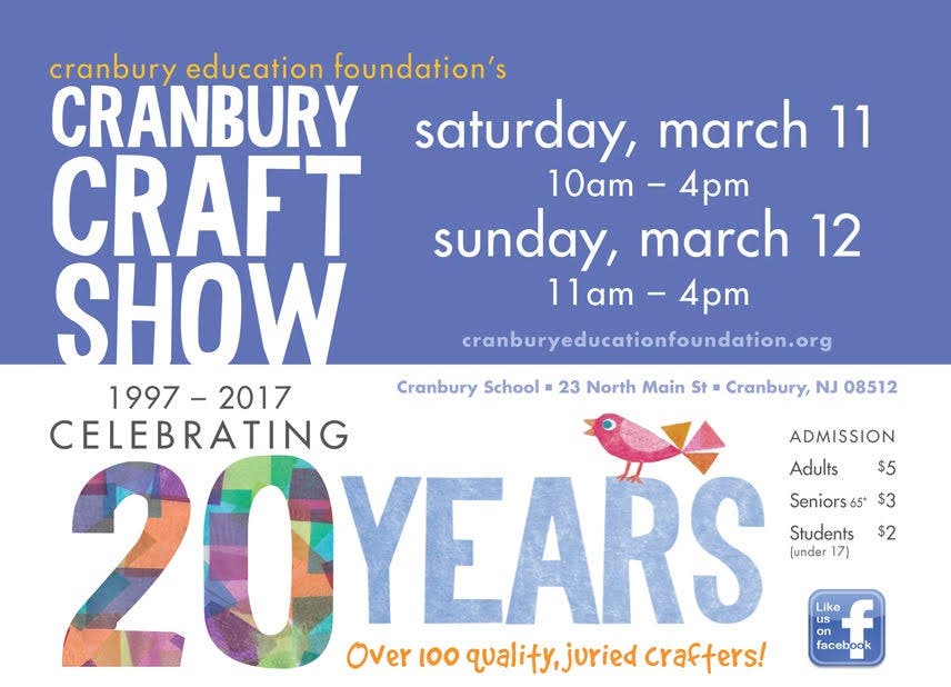 The historic village of Cranbury will host its 20th Annual Cranbury Craft Show on Saturday, March 11 and Sunday, March 12, featuring 120 juried artisans. New crafters will join returning favorites to showcase work in a variety of media including jewelry, fabric arts, ceramics, toys, wood crafts, food, florals, glass, clothing, and more.