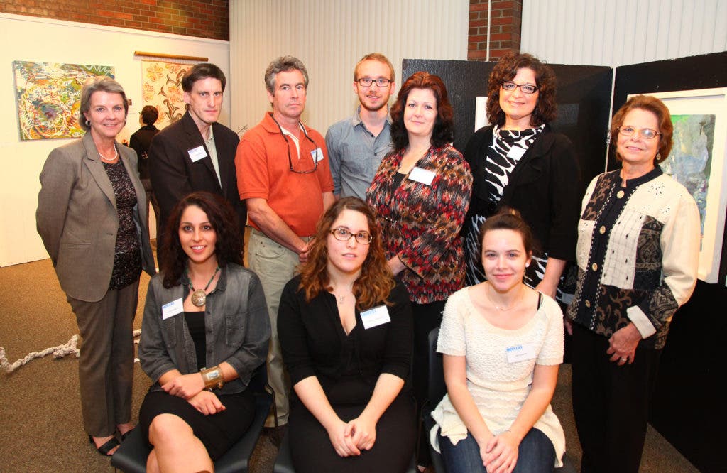 The artists posed for a photograph. Seated from left: Ashley Hanania ’05 (Princeton), Gabrielle Ambrozia ’11 (Parlin), Amy Glass ’09 (East Brunswick). Standing: Veronica Clinton, director of development and alumni relations and executive director of the MCC Foundation, Michael Hart ’84 (North Brunswick), Eric McNerney ’85 (Neptune), David Link ’09 (East Brunswick), Linda Stockman ’86 (Bethlehem, PA), Michele Sutera ’08 (Bushkill, PA), and Dorothy Bitetto ’69, an Alumni Association trustee.