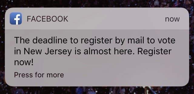 The social media giant sent out a "push alert" that popped up on home screens of users phones reminding New Jersey voters their registration deadline is coming up. The alert was sent just after 8:00 pm on Tuesday, exactly one week before the Oct. 18 deadline.