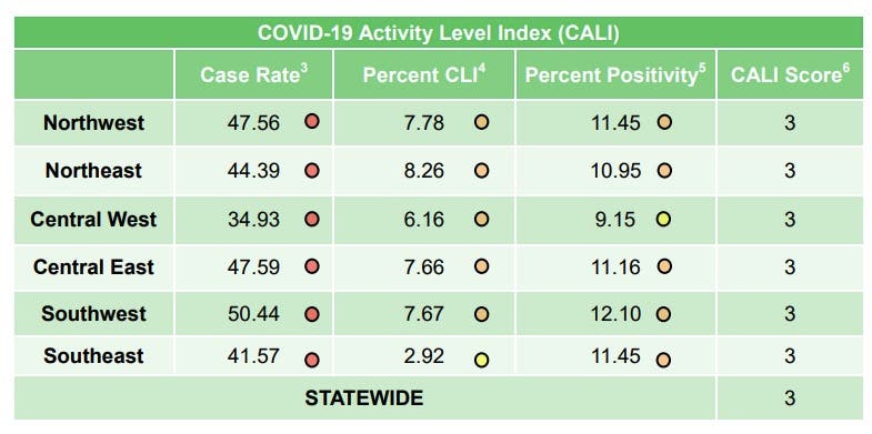- The new daily case rate in each of the counties rose to 10 or more per 100,000 people.
