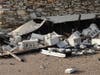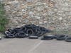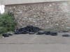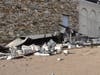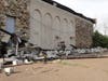 Much of the design work has been hacked off the building, and the parking lot is overgrown with weeds. The rear of the site has become a dumping ground for old tires.