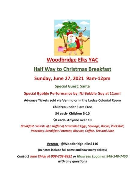 Woodbridge: Meet Santa in June! The Woodbridge Elks will hold their "Halfway to Christmas" summer breakfast fundraiser 9:00 a.m. - 12:00 noon at the Woodbridge Elks YAC The Bubble Guy will perform for the kids at 11 a.m. Learn more: https://www.twp.woodbridge.nj....