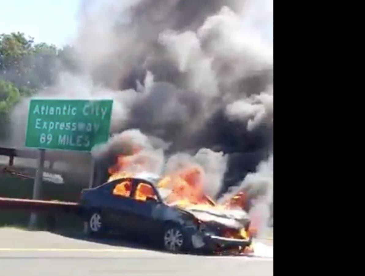 A video shows a car engulfed in flames as firetrucks blew their sirens on the Garden State Parkway on Thursday.