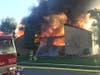 A roof collapsed in the fire, briefly trapping two firefighters, but they were not injured.