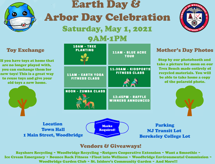 WOODBRIDGE, NJ — Woodbridge will hold its Earth Day and Arbor Day town celebration Saturday, May 1 from 9 a.m. - 1 p.m. outside Woodbridge Town Hall.