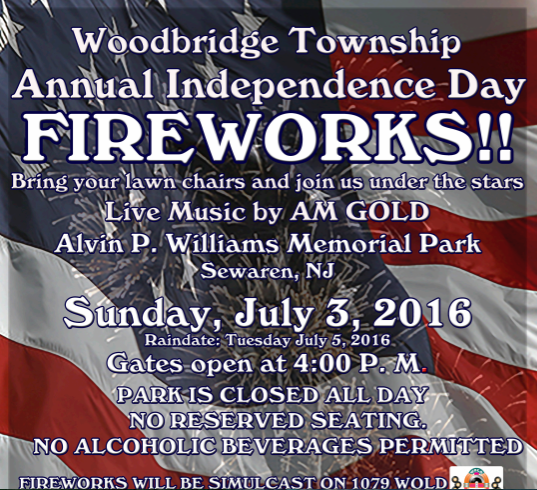 Woodbridge Township will host its Independence Day fireworks celebration on Sunday, July 3 this year, with a rain date of Tuesday, July 5.