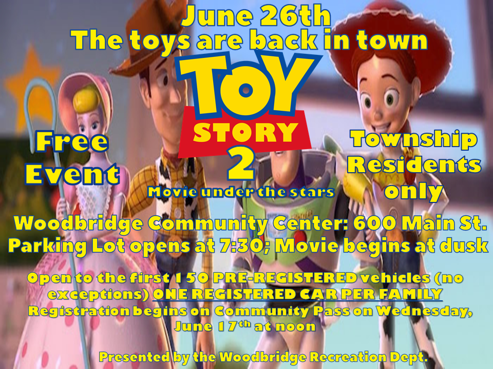 "Toy Story 2" will be screened from the Woodbridge Community Center parking lot. You must register your car in advance on Community Pass.