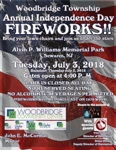 Woodbridge fireworks are on Tuesday, July 3. Gates open at 4:00 p.m. at Alvin P. Williams Memorial Park on the Sewaren waterfront.