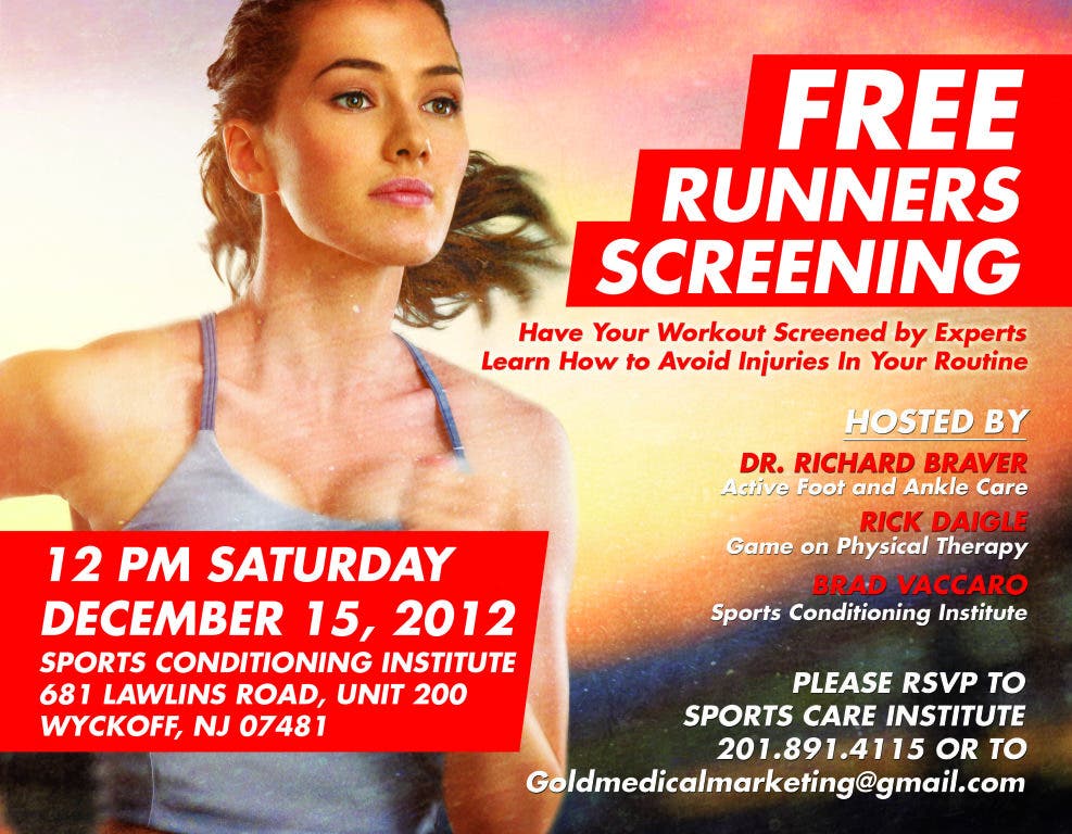 Sports Care Institute in Wyckofff, NJ has teamed up with two medical specialists to host a NO COST Injury Prevention Screening for runners.