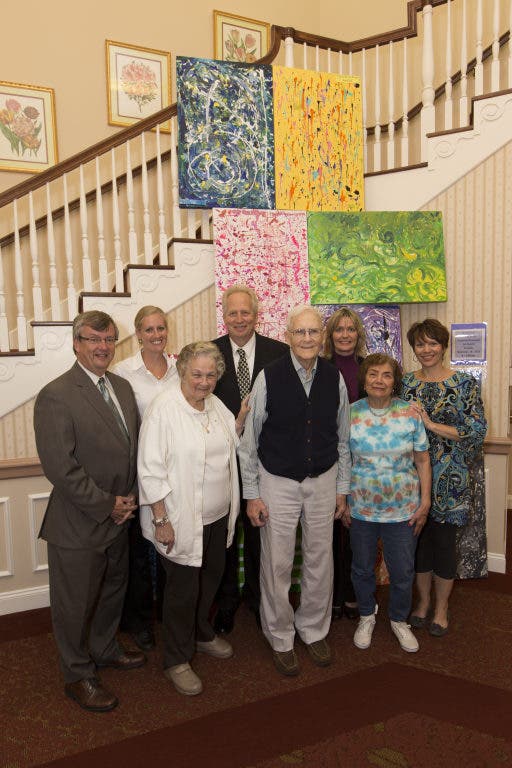 CUTLINE: The Longview Assisted Living Residence at Christian Health Care Center (CHCC) in Wyckoff recently held its Third Annual Art Exhibit. Creative works in a variety of themes and mediums created by the residents were on display. The art work pictured in the background was created by the Longview residents in the style of Jackson Pollack. CHCC’s Activity Council developed the idea to have all the various programs at CHCC create these canvases, which will be displayed together as one large masterpiece in the Auditorium. Pictured, first row, from left are Douglas A. Struyk, CPA, LNHA, CHCC President and CEO; and Longview residents Maureen Maynard, Otto Groel, and Hilda Colomba. Pictured, second row, from left are Cheryl Wolf, ADC, Longview/Courtyard Activities Director; John Browne, Residential Services Vice President; Pamela Rooney, CALA, CTRS, ADC, Longview Administrator; and Kathe Carrero, Longview Activities Coordinator.