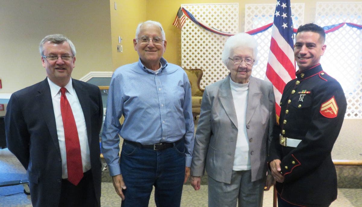 CUTLINE: Pictured, from left, are Douglas A. Struyk, CPA, LNHA, Christian Health Care Center (CHCC) President and CEO; veteran Stanley Grossberg, CHCC volunteer; veteran Madge Schiepan, a resident of The Longview Assisted Living Residence at CHCC; and Corporal Anthony Vincent DeMauro, United States Marine Corp.
