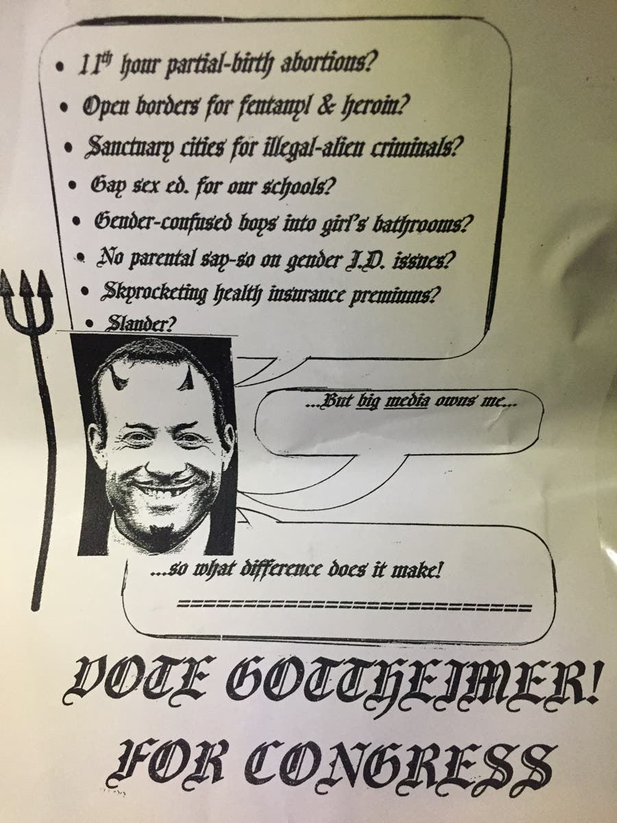 The fliers depict Gottheimer as a devil who is owned by 'big media.'