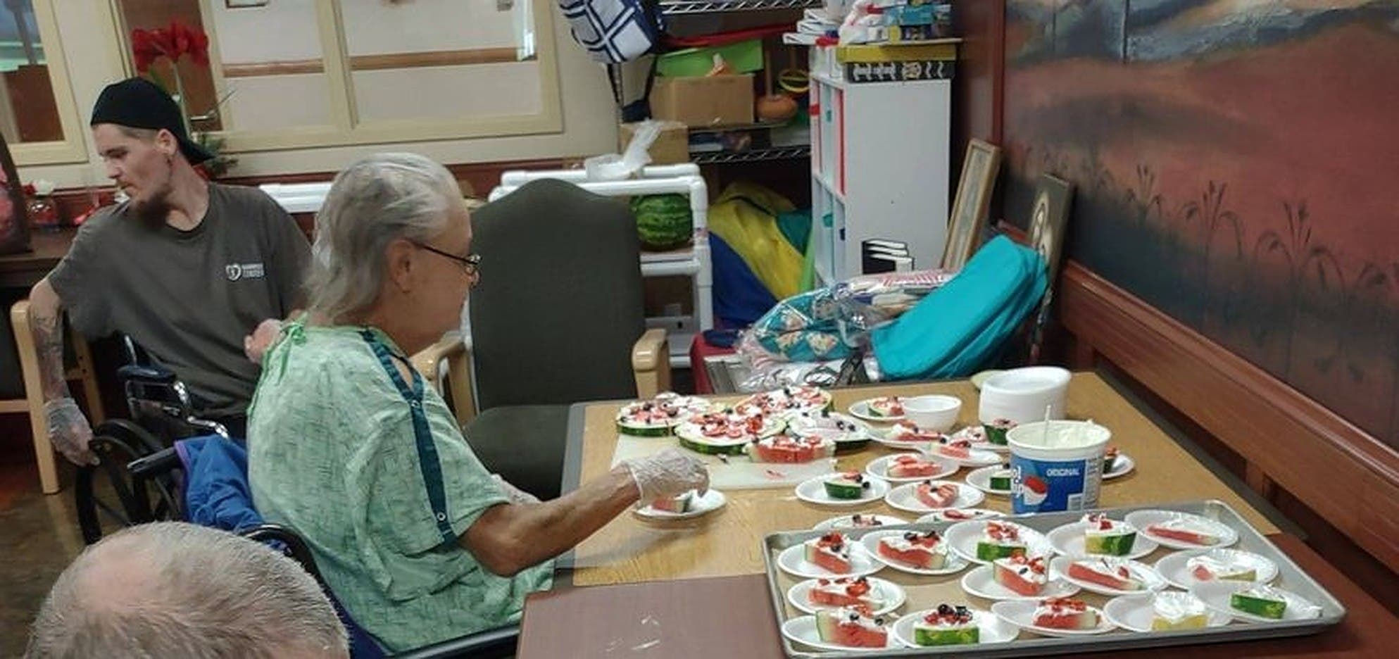 The residents helped the Recreation staff prepare, and plate fruit pizza where the staff sliced watermelon into the shape of a pizza, then added a thin layer of cool whip and topped it with blue berries and strawberries. Then staff offered all of the residents and co-workers a slice. Making healthy food to be fun is a great way to eat healthy.