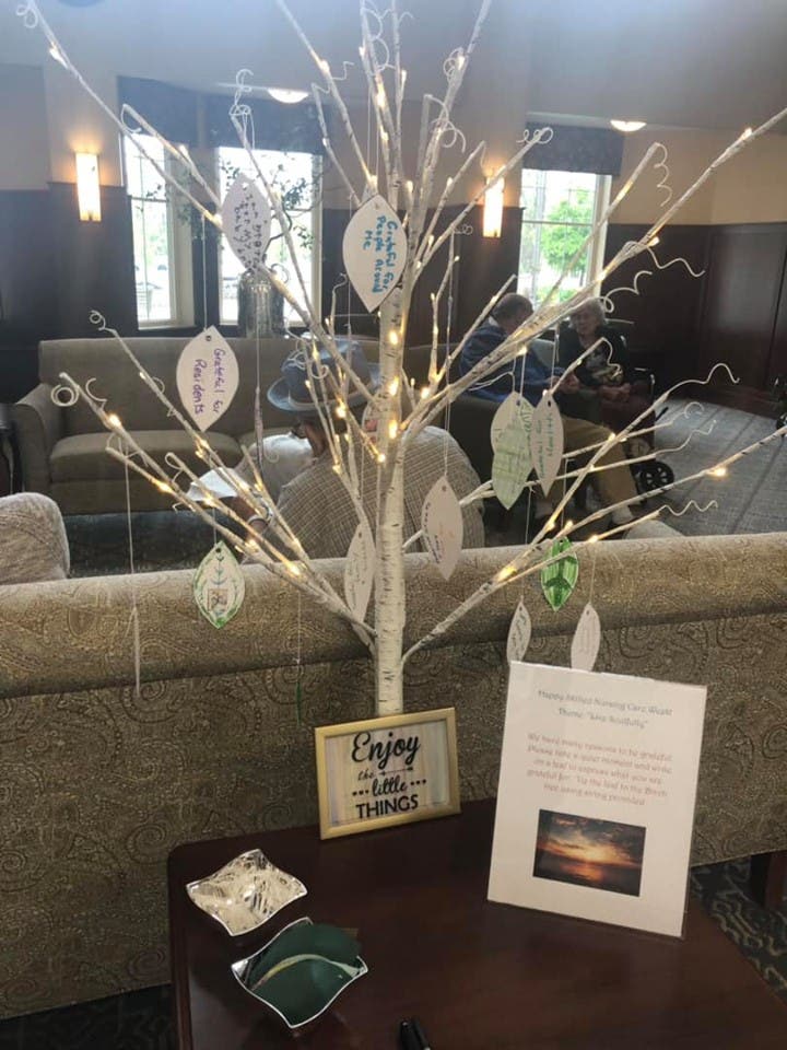 The flowers are a big part of national Nursing Home Week at Schenectady Center as Ms. Pidgeon and her team did flower arrangements with the residents, quoting the theme as "Stopping to Smell the Roses". The facility also planted seeds with the residents, enjoyed the outdoors in a nature walk and, earlier this week, created a stunning "grateful tree" for the lobby whereby residents and family members would create their own saying on a leaf.