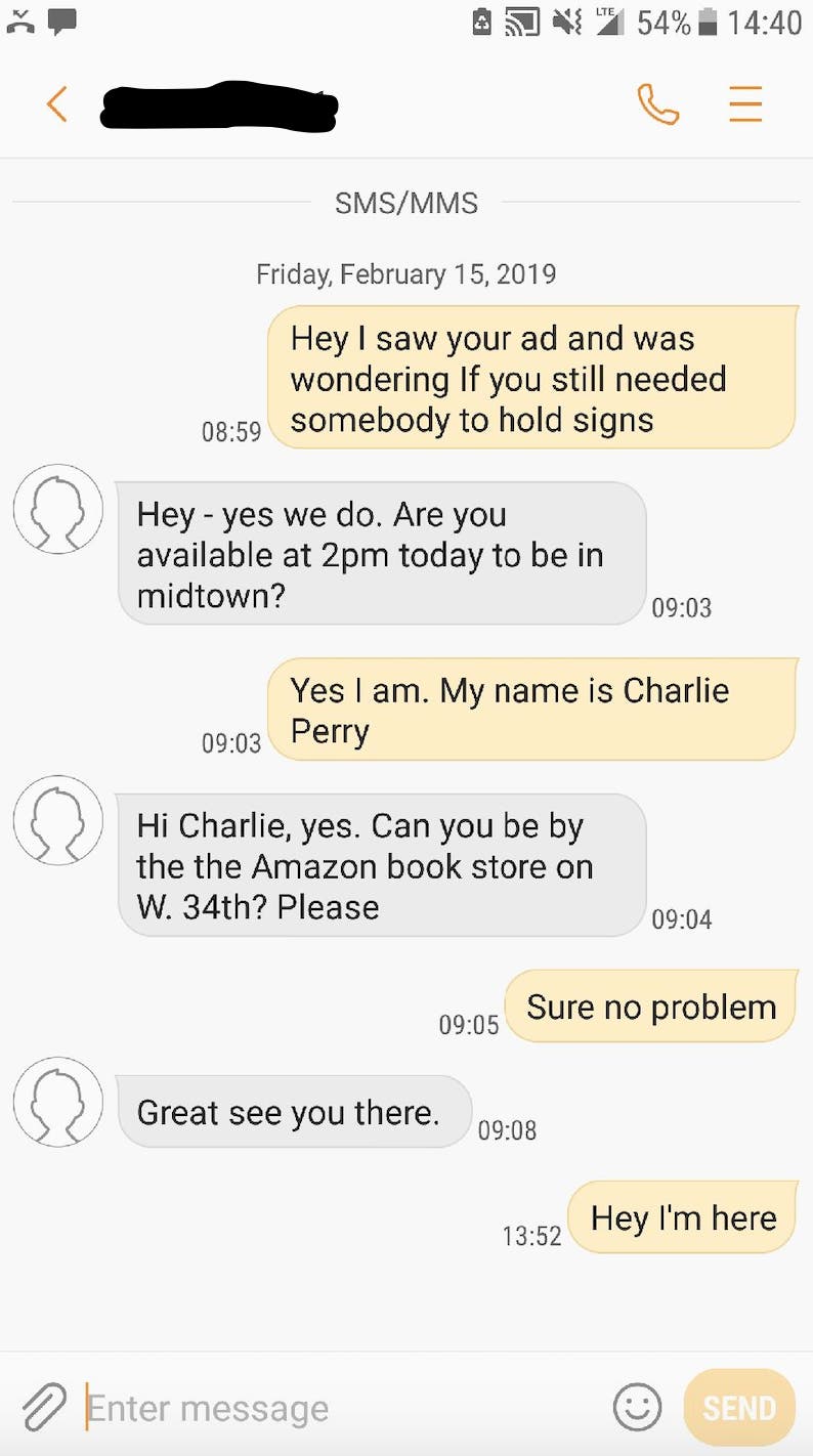 The PR person was reached by phone at the same number Perry texted to respond to the ad. The rep said he didn’t recall the text conversation. "People were texting me how they could come out and support,” the PR person told Patch.
