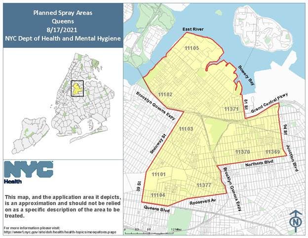 The city's mosquito-killing trucks will drive around those sections of northwest Queens on Tuesday, Aug. 17 between the hours of 8:30 p.m. and 6:00 a.m. the following morning, weather permitting.